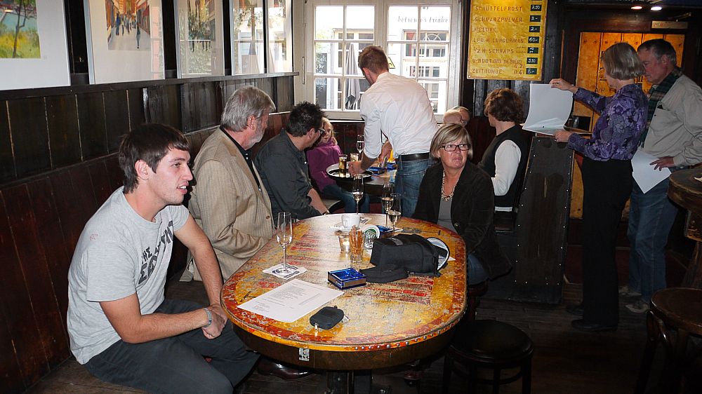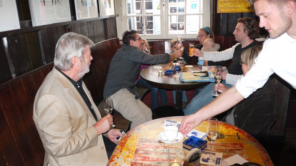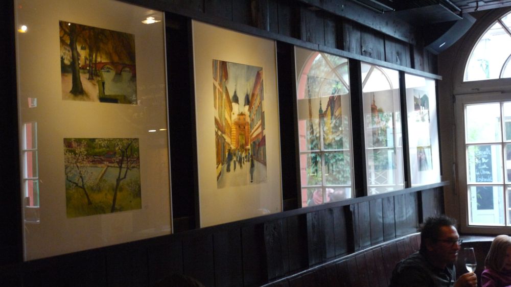 Am 09.10.11 fand die Vernissage für Dieter Hecht's nunmehr schon vierte Ausstellung in der Destille in Heidelberg statt. Aufgrund des herrlichen Herbstwetters war der Kreis der Besucher doch überschaubar. Diejenigen, die gekommen waren, hatten mit dem Künstler einen schönen Nachmittag. Sie konnten sich davon überzeugen, daß seine Heidelberg-Aquarelle in der Destille einen geeigneten Platz gefunden haben. Die kraftvollen Farben entwickeln an den dunklen Holzwänden des Szenelokals eine besondere Leuchtkraft. Auch sein neuer Kalender für 2012 und die Kunstkarten fanden großes Interesse.